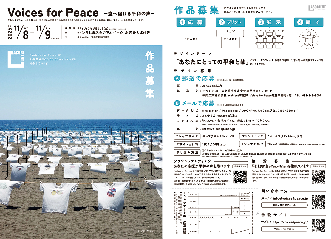 『Voices for Peace』は、広島から新しい平和の姿を描き出す文化活動です。地域に根ざした企業や団体の皆さまにとって、今この活動に関わることは、次代への想いを社会へ伝える絶好の機会となります。